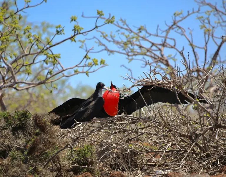 One of the uplifted islands of Galapagos: North Seymour, is a small flat island that has the perfect conditions for a nesting site for the two species of frigate birds (great and magnificent) that coexist in the Islands. Frigate birds are the only marine sea birds in Galapagos that they lost the capability to plunge in the water because they don’t produce enough oil to cover all of their plumage and that enables them to float; for this reason they need to steal the food from the other seabirds, getting the “pirates of the air” nickname. Here is the only place all year around the courting dance, especially males displaying the bright red gular sack to get a female attention. Blue footed boobies, land iguanas, sea lions, swallow tailed gulls, Darwin finches and lava lizards we will encounter along the trail of our excursion, and on a lucky day, you might even come across a Galapagos Snake.