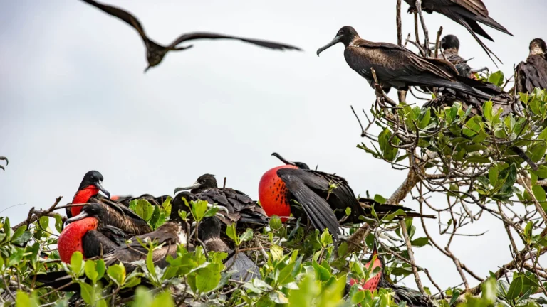 The magnificent frigate bird, a large black bird with a long wingspan, and a hooked beak, is extremely fast and has excellent vision. Frigate birds are known for the large red pouch on their necks. During mating season the males throw back their heads, inflate the pouch (sometimes to the size of a soccer ball), and shake trying to capture the attention of female frigates.
